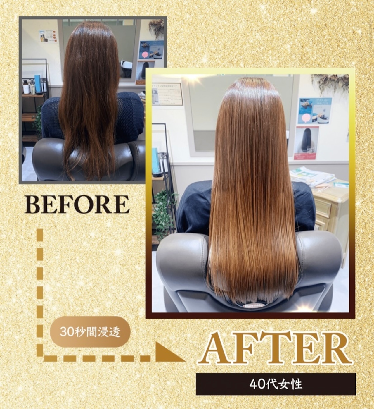 この2つの特徴から低分子化活性ケラチン配合のトリートメントを使用していただく事で、髪内部に栄養分を閉じ込め、整えたキューティクルで蓋をし外部へ栄養分が逃げないようにします。